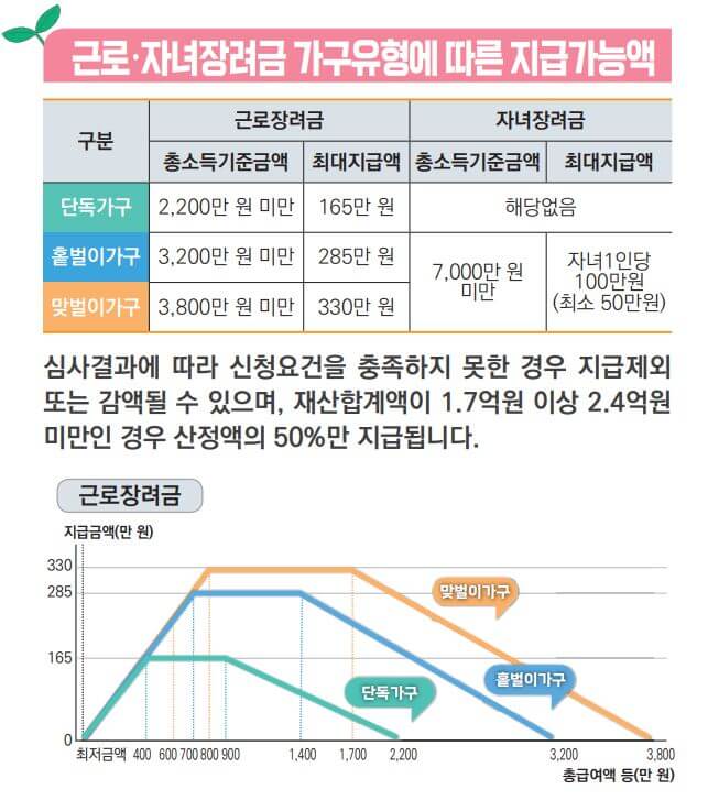 근로장려금 | 2,200만 원 | 3,200만 원 | 3,800만 원 |