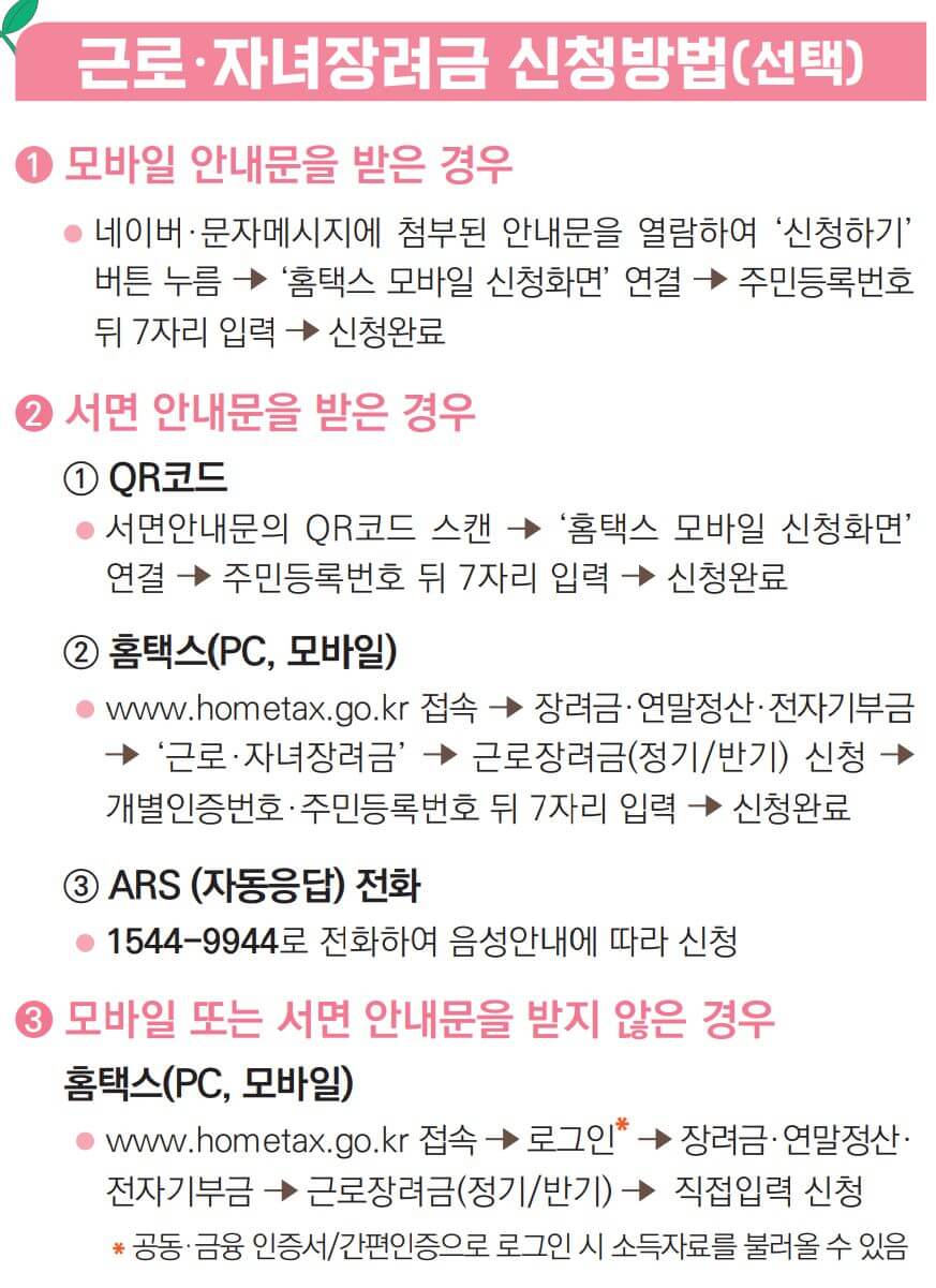 - 홈택스(모바일, PC) : 홈택스 접속 → 장려금, 연말정산, 기부금 선택 → 근로장려금 반기신청 → 직접입력 신청 → 신청요건 확인 → 인적사항 작성 → 전세명세금 작성 → 계좌번호 및 연락처 작성 → 신청확인 및 전송